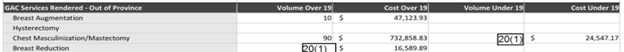 The reason for the difference between the number of surgeries approved and performed is not clear. It is possible that there was enough of a time delay between the approval of a gender surgery and the performance of a gender surgery that the person aged out of the data. For example, an 18-year-old could be approved for a mastectomy, but that mastectomy isn’t performed until she is 19. Alternatively, a young person may initially want surgery and receive approval but then decide they don’t want it.