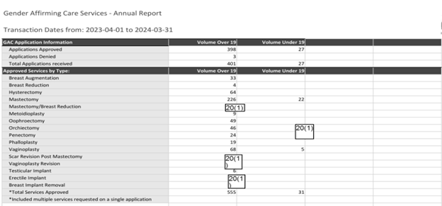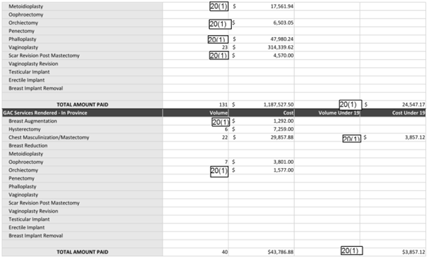 Some data on the number of minors who are medically transitioning in Nova Scotia have been uncovered by various Freedom of Information Requests, mostly filed by Melanie Bennet from Juno News. The FOIs revealed that 21 “top” surgeries (mastectomies) and 9 “bottom” surgeries were approved for minors in the fiscal year 2023-2024 in Nova Scotia and out of province. (In an attempt to maintain privacy, every number that is below 5 is redacted under the code 20(1). Hence, each cell obscured by 20(1) could be read as below 5 but at least 1.)