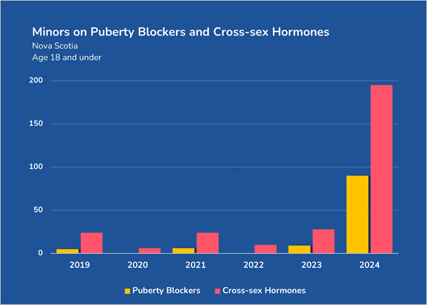 Unlike most other provinces, Nova Scotia has released some data on the number of minors receiving puberty blockers and cross-sex hormones in recent years. Prescriptions for these hormonal interventions were relatively low from 2019-2023, with no more than 9 minors receiving puberty blockers and 37 receiving cross-sex hormones in a given year. But these numbers exploded in 2024 when 90 received puberty blockers and 195 received cross-sex hormones the following year. That is a 1000% and 696% increase, respectively, in a single year.