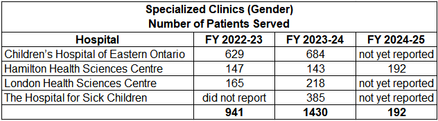 A couple of FOI requests to the government of Ontario confirm this. The government confirmed that they do not comprehensively track the number of minors receiving puberty blockers or cross-sex hormones at community health clinics from family doctors. However, the Ministry of Health began receiving data on the number of children and adolescents served at the four hospital-based gender programs. Due to a lack of reporting, the only total that we can report with certainty is that these hospital-based pediatric gender clinics saw 1,430 children in 2023-24. The Children’s Hospital of Eastern Ontario (CHEO) in Ottawa saw more than half of those patients. And in three of the four comparative years, the number of minors visiting these clinics increased from the previous year.
