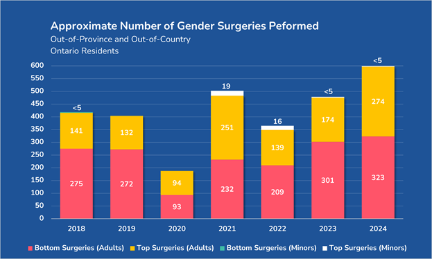From 2018-2024, Ontario sent almost 3,000 individuals out of the province and even out of the country for gender surgeries. That averages out to about 420 per year. For the sake of context, Ontario sent more residents out of the province for gender surgeries than the province of Alberta performed last year. Now, Ontario doesn’t send patients out of the province for these surgeries because no institution provides them in Ontario. As mentioned above, hospitals and gender surgery clinics provide the full gamut of gender surgeries in the province. Patients were likely sent out of the province and out of the country because there was too much demand for these surgeries for these Ontario hospitals and clinics to handle. Sending patients outside Ontario allowed them to get surgery faster.