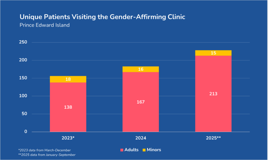 In response to our access to information request, Prince Edward Island did not have any data on the number of people who visited a primary care provider for gender dysphoria or the number of patients currently prescribed puberty blockers or cross-sex hormones. The province was only able to release the number of patient visits and the number of unique patients to the province’s one Gender-Affirming Clinic. This data covered only the last three years and does not capture all of 2023 nor all of 2025.