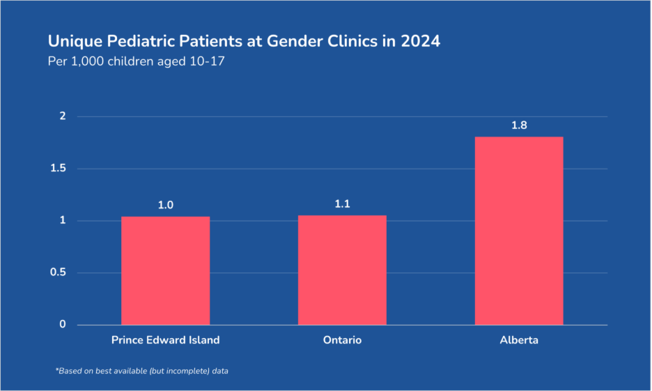 These numbers may be small, but that is because Prince Edward Island has a small population of around 182,000. (For comparison, the entire population of the island is comparable to the mid-sized cities of Sherbrook, Oshawa, or Abbotsford.) Thus far in this series, we have data on the number of unique pediatric visitors to the Gender-Affirming Clinic in Prince Edward Island, the hospital-based gender clinics in Ontario, and the hospital-based gender clinics in Alberta. If we compare the number of children and adolescents who visited these with the number of children and adolescents in each of these provinces, the rates of minors seeking help with their gender dysphoria are comparable. In Prince Edward Island, there are 1.0 pediatric gender clinic visits per 1,000 children aged 10-17. In Ontario, that rate was 1.1. In Alberta, it was 1.8. While this data is incomplete (e.g. it does not take into account community gender clinics in Ontario or Alberta), this gives us some idea of the rate at which children and adolescents are seeking help with gender dysphoria.